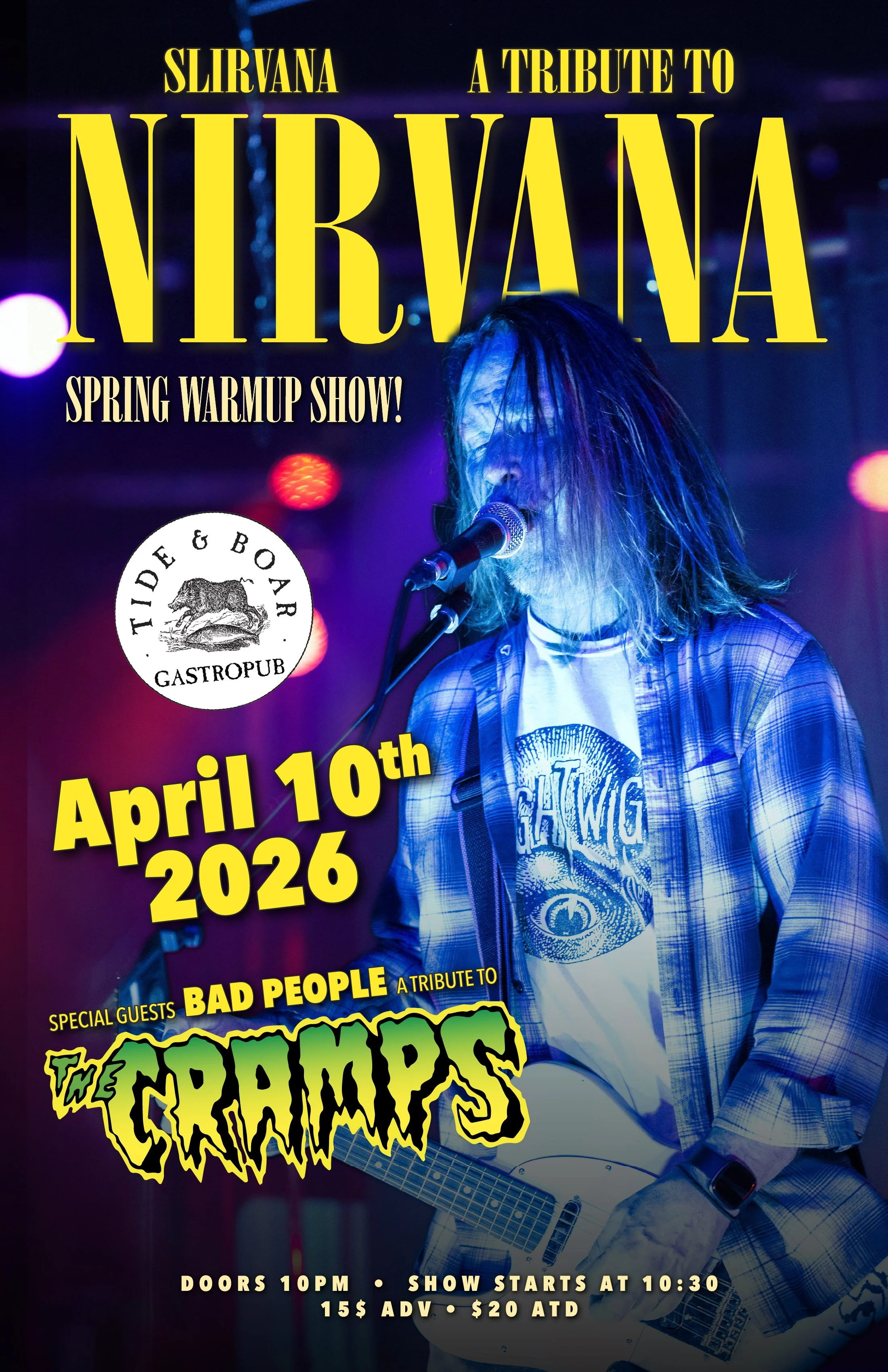 Grunge meets psychobilly for one wild night at the pub. ⚡️Slirvana (Nirvana tribute) with special guests Bad People (tribute to The Cramps) take over the stage April 10th at Tide & Boar Pub. Expect loud guitars, throwback anthems, and all the songs you grew up turning all the way up.